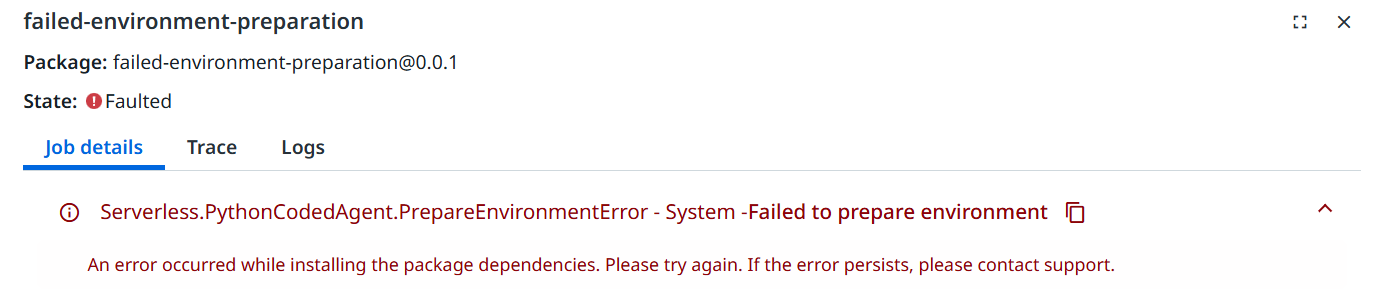 "Code": "Serverless.PythonCodedAgent.PrepareEnvironmentError",